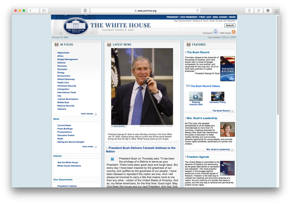 以下为白宫官网在2009年1月19日的样子。当时,小布什还是美国总统。自奥巴马上台之后,白宫的网站就经历了一次大改版,并且看起来还会继续下去。
